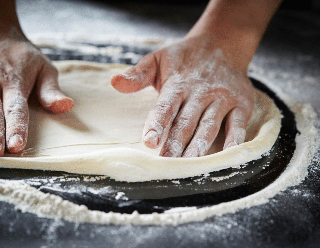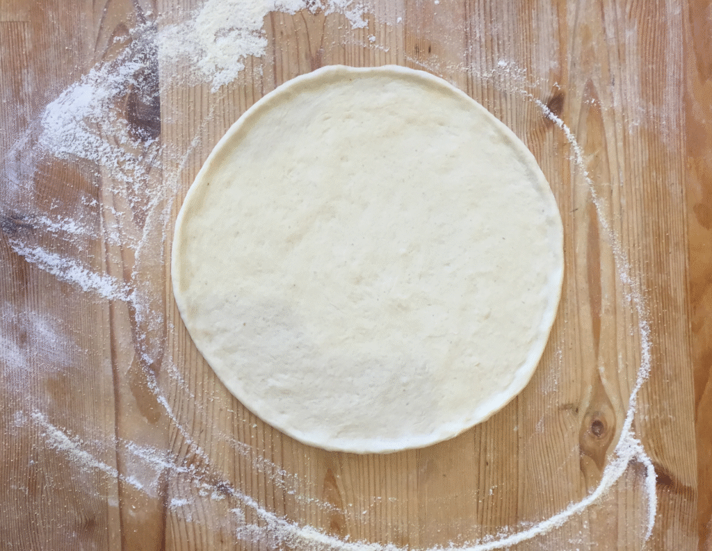 1. Aplastar el bollo desde el centro hacia afuera, sin tocar el borde para que se forme el cornicione.